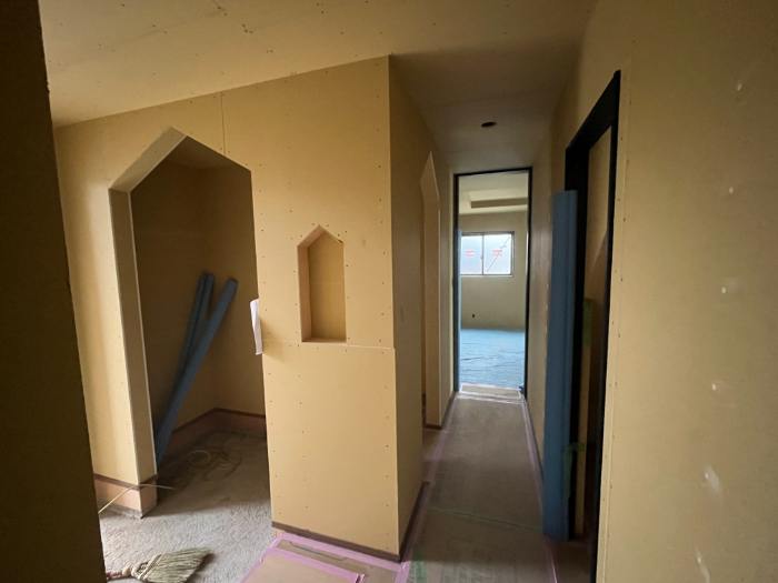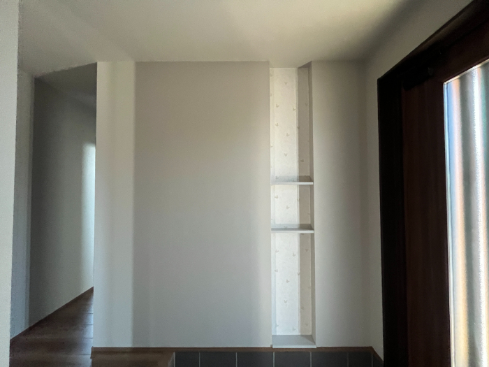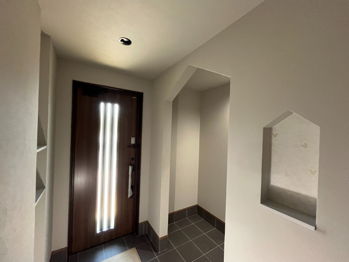 玄関を入ると、大きい三角屋根のシューズクローゼットの入口と小さい三角屋根のニッチがお出迎えします。