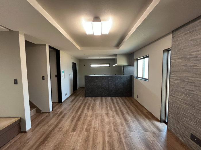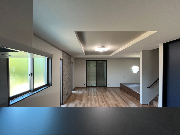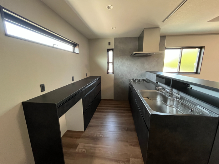 キッチンからの眺めになります。全体的にグレーのトーンで統一し落ち着いた雰囲気になっています