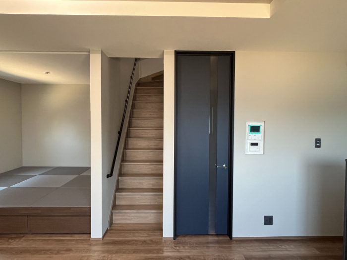LDK のドアは、天井高に揃えました。部屋が広く見える効果があります。