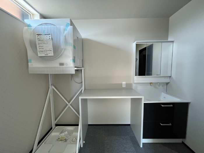 左側にガス幹太くんと洗濯機、右側に洗面台、中央に造作で作業台を設置