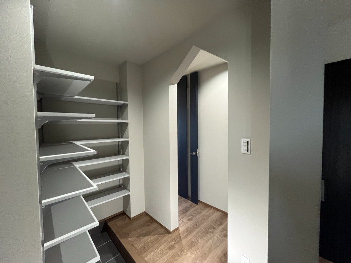 L型の可動棚を配置、その他土間もあり収納力は抜群です。