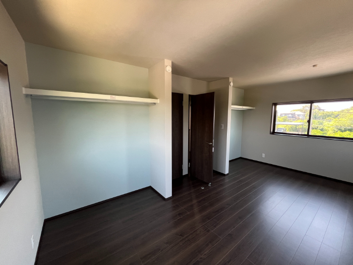 収納には、あえて建具を付けず予算削減と部屋が広く見える効果があります。