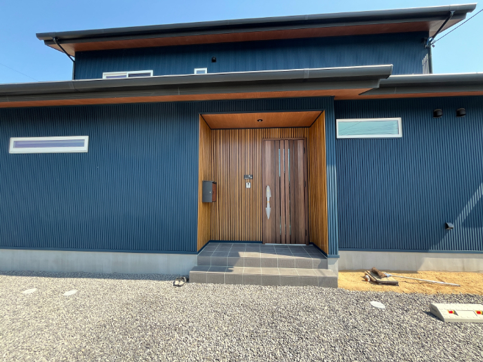 ダークブルーの外壁にホワイトのサッシ