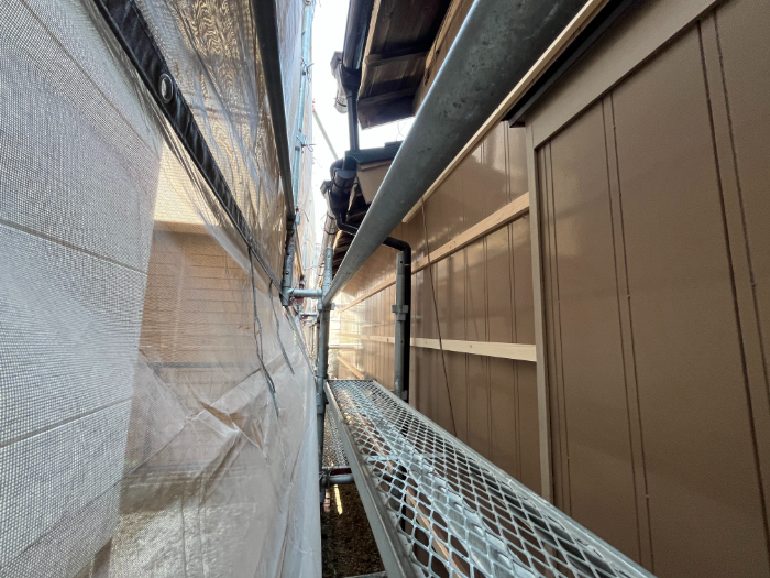 次に足場を設置しますが、車の駐車スペースの問題や平屋であるので、今回の現場は大部分を脚立の足場で作業で行いました。