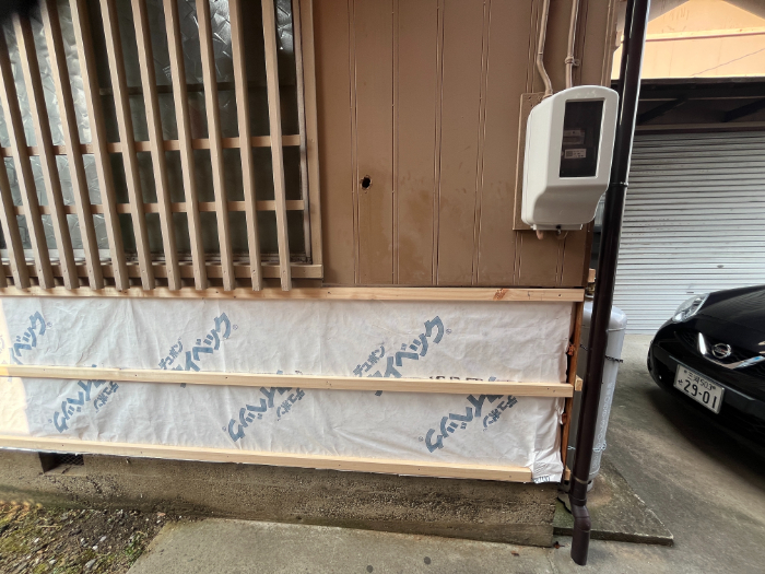 外壁を撤去した部分には、防水シートを張り雨水の進入を防ぎます。